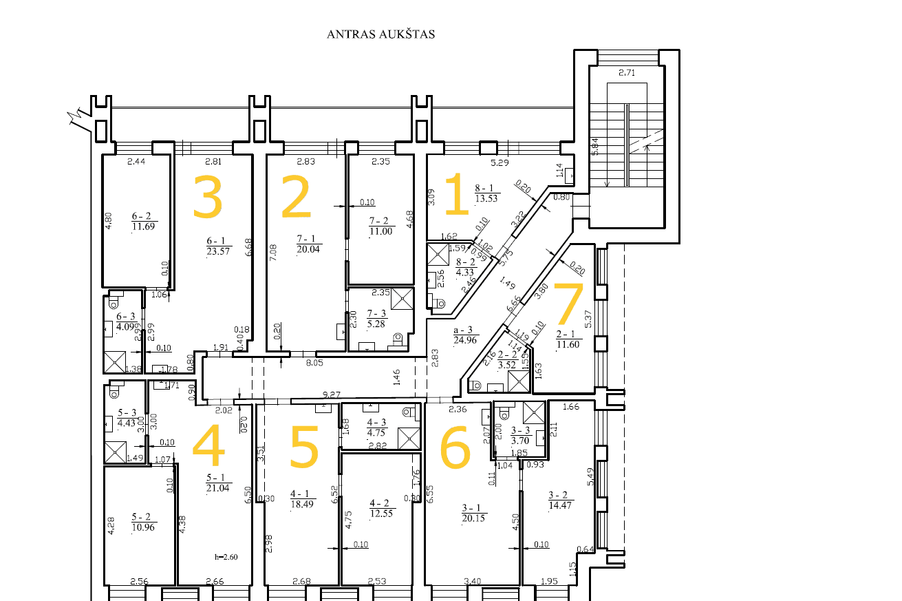 Aukštai: visi apartamentai įsikūrę antrame ir trečiame pastato aukšte
