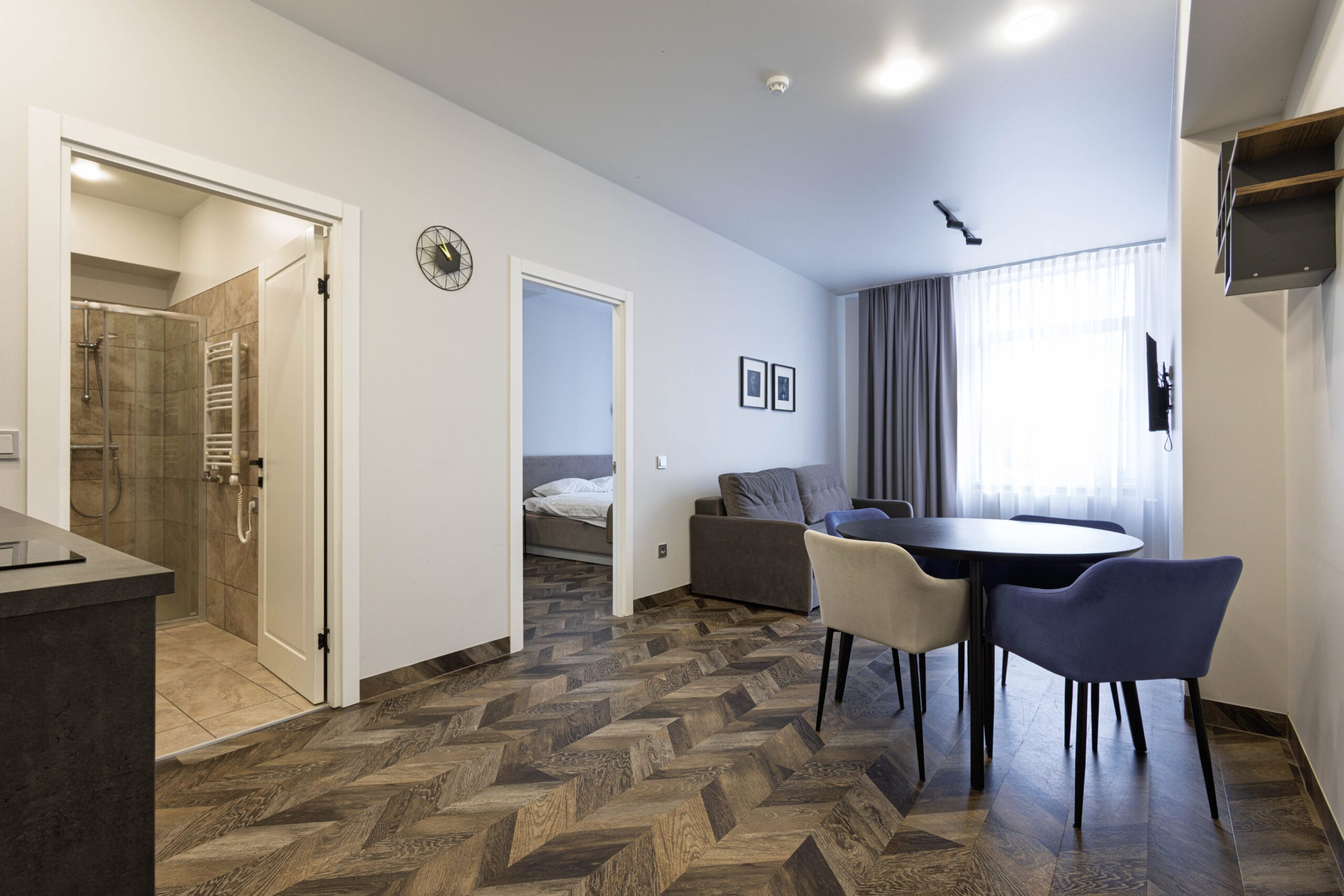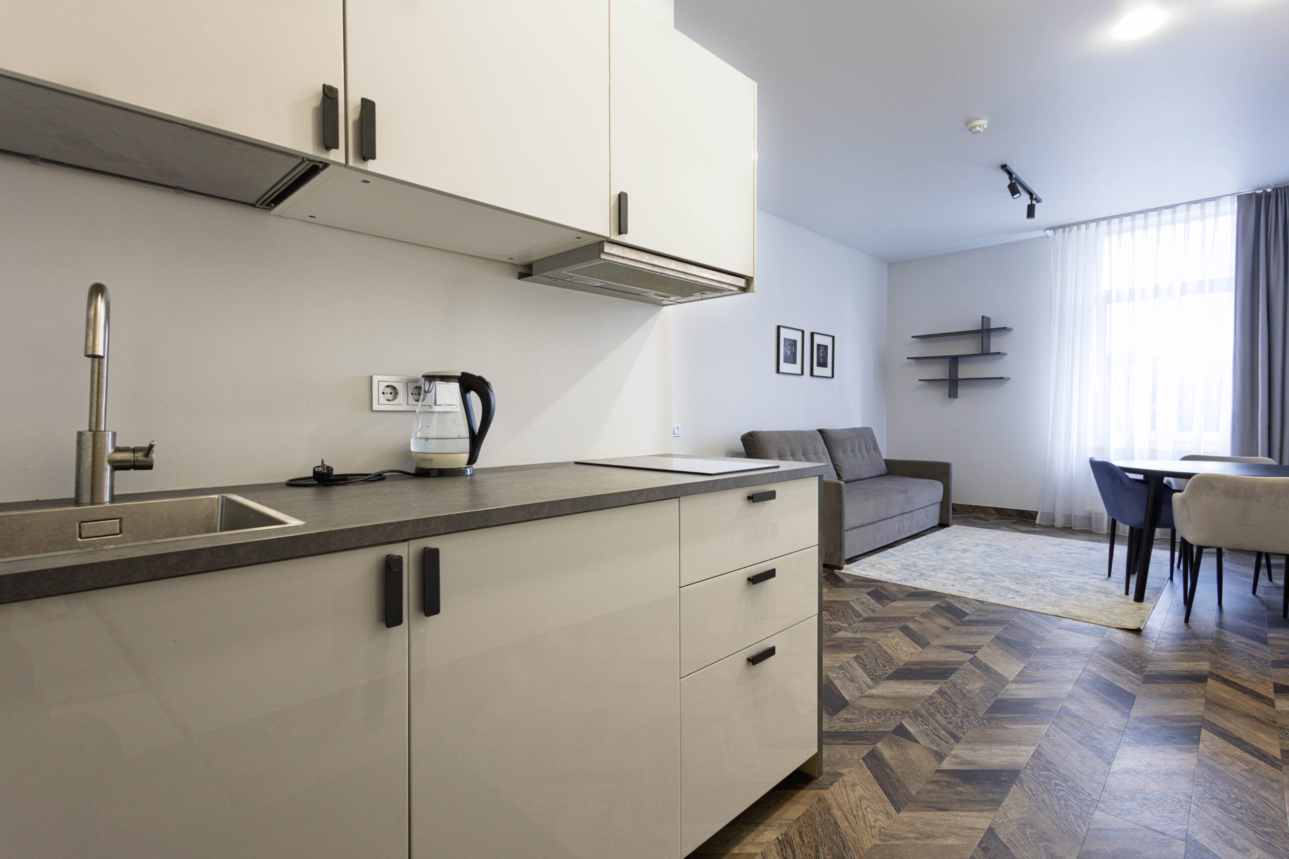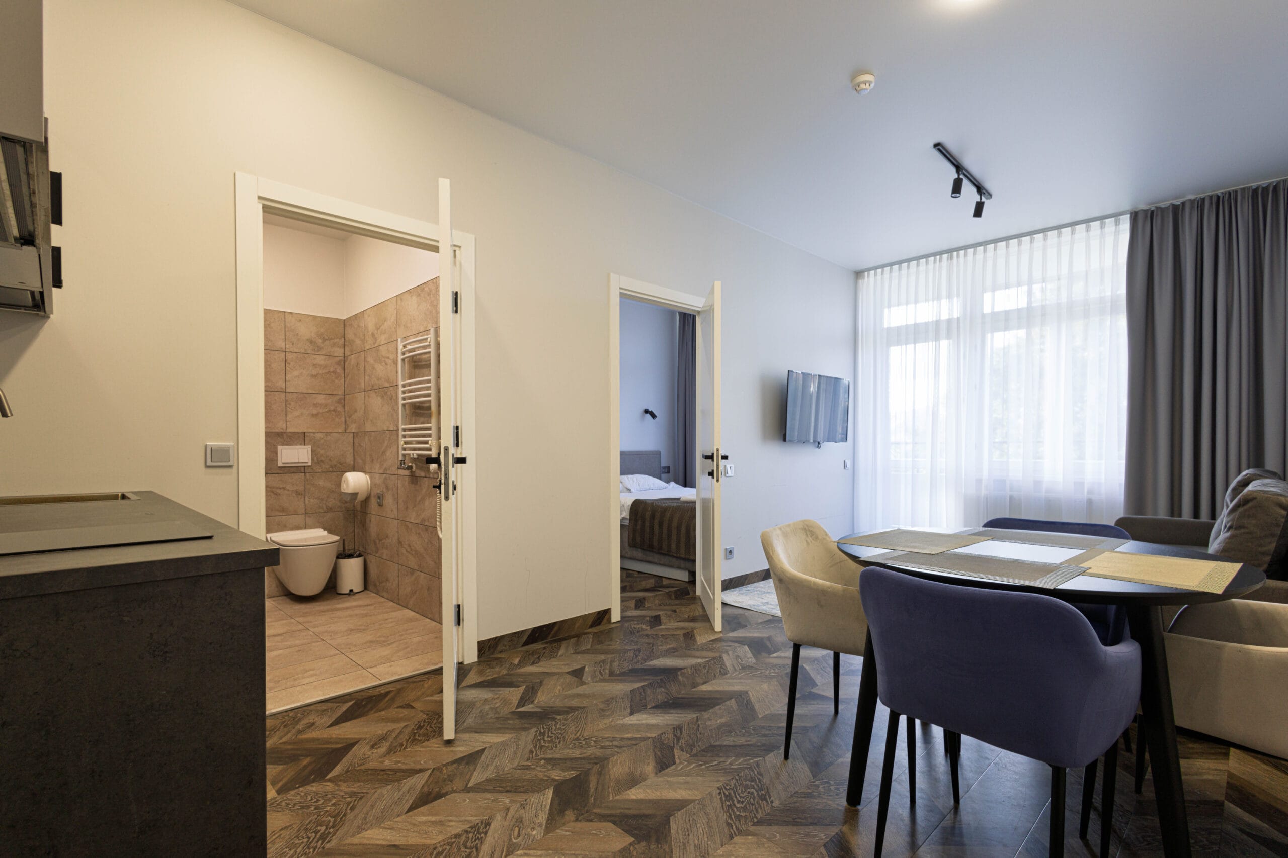 Pilnai įrengti apartamentai su buitine įranga – šaldytuvai, virtuvės įrankiai, televizoriai