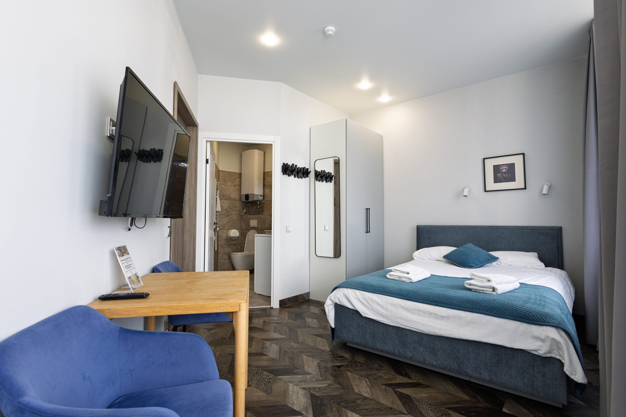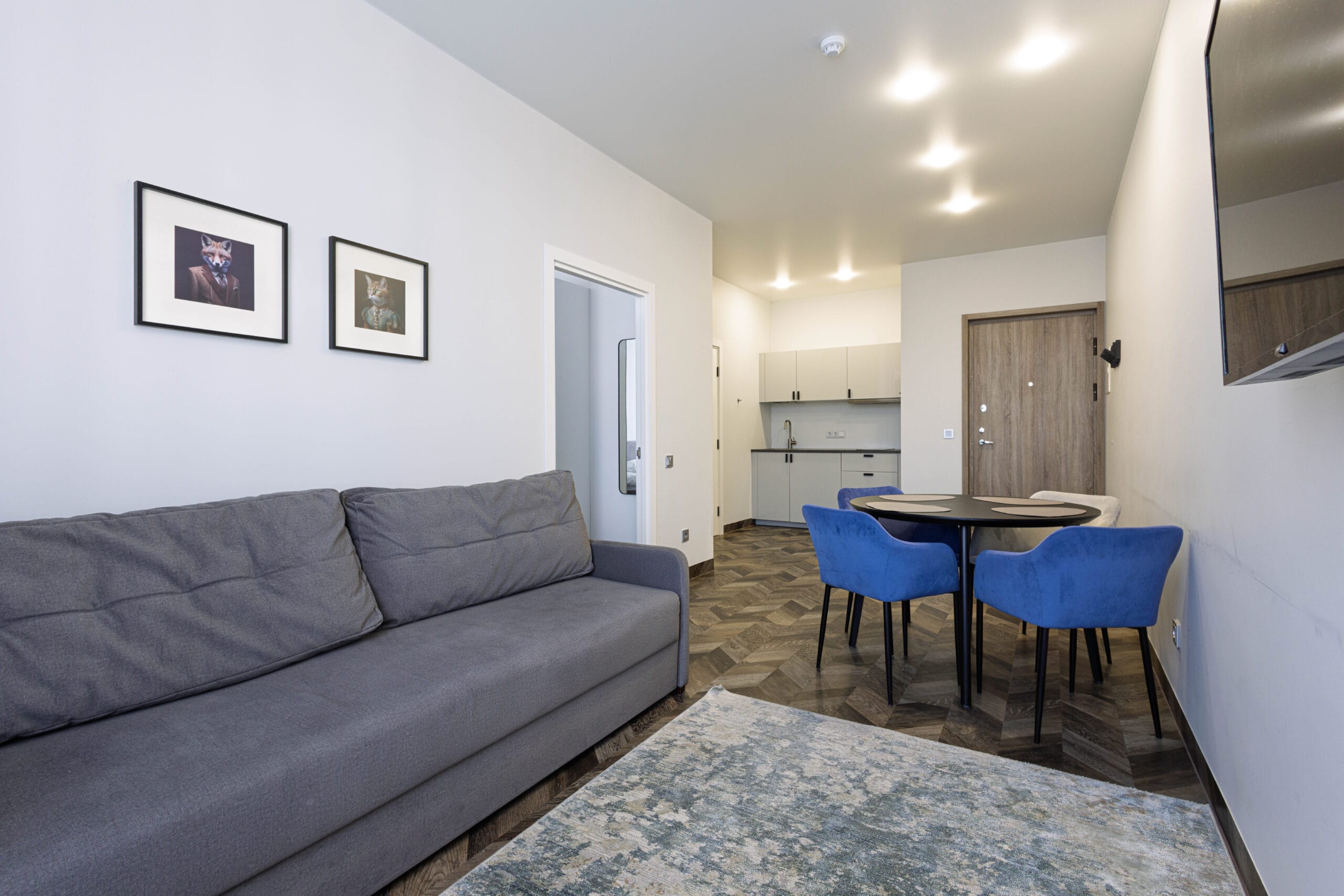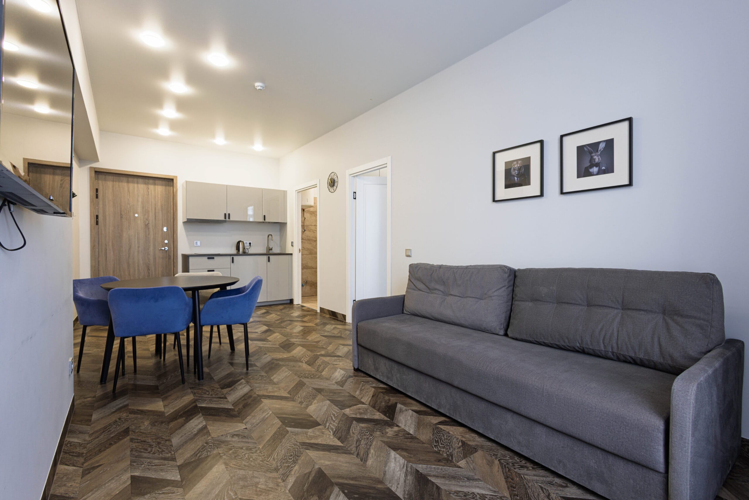 Pilnai įrengti apartamentai su buitine įranga – šaldytuvai, virtuvės įrankiai, televizoriai